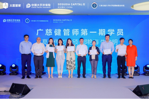 中國太保壽險總經(jīng)理蔡強(qiáng)(左一 )、上海瑞金醫(yī)院副院長邱力萍(右一 )為廣慈健管師頒發(fā)證書