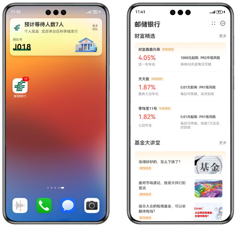 深度擁抱鴻蒙系統(tǒng),打造服務新體驗。郵儲銀行鴻蒙版手機銀行、郵儲信用卡App不僅全面覆蓋Android版和IOS版全部功能,為客戶提供“三端”一致的客戶體驗,更借助鴻蒙操作系統(tǒng)的新特性,為客戶打造出多項新體驗。例如,在“實況窗”基礎上實現(xiàn)的網點預約,可向用戶展示網點排隊信息;基于鴻蒙元服務的郵儲銀行服務卡片讓客戶無需啟動App即可瀏覽最新的投資理財產品。