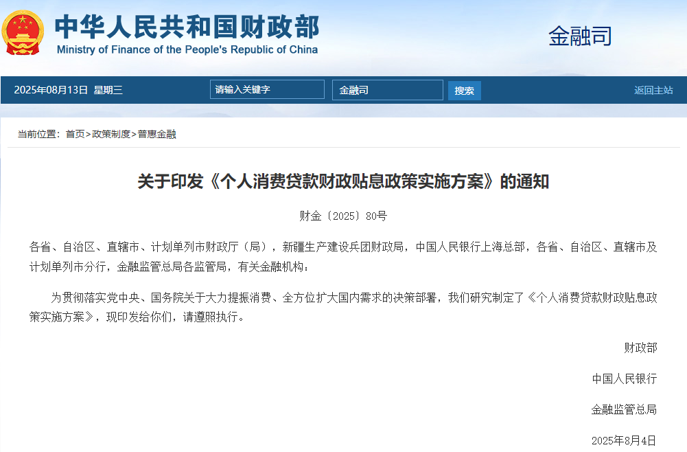 深圳新聞網(wǎng)2025年8月13日訊(記者 湯莎)近日,財(cái)政部、中國(guó)人民銀行、金融監(jiān)管總局印發(fā)《個(gè)人消費(fèi)貸款財(cái)政貼息政策實(shí)施方案》(以下簡(jiǎn)稱方案),中央及省級(jí)財(cái)政將對(duì)符合條件的個(gè)人消費(fèi)貸款實(shí)施貼息。