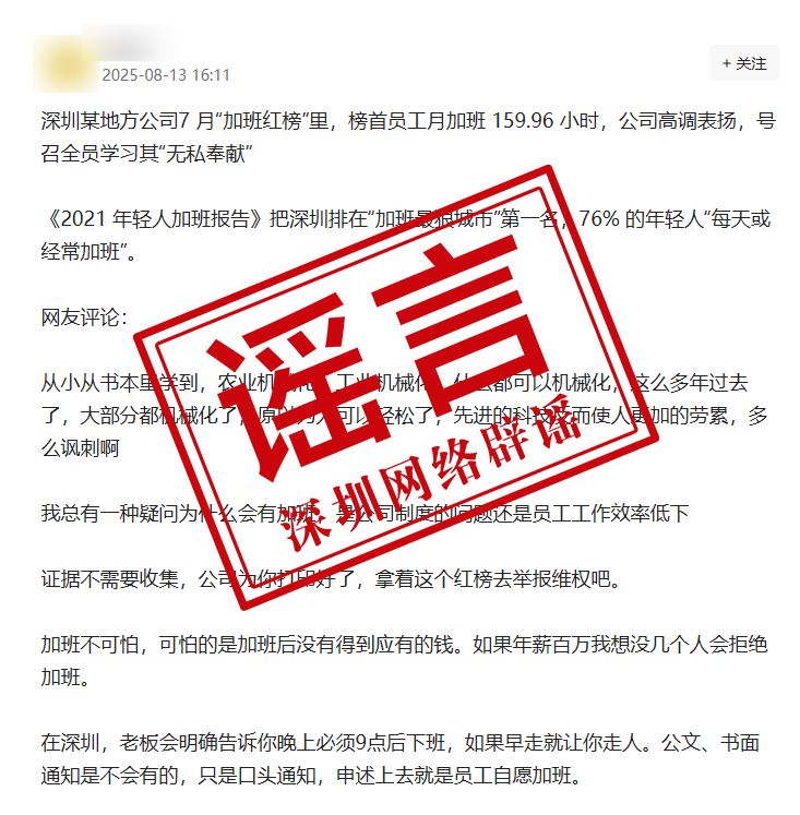 近日,一則《關于加班的通報表揚》在社交平臺引發(fā)熱議。部分網(wǎng)帖將涉事企業(yè)與深圳強行關聯(lián),冠以“深圳某公司”名義進行傳播,并稱深圳存在普遍的加班現(xiàn)象。經(jīng)核實,涉事企業(yè)非深圳企業(yè)。