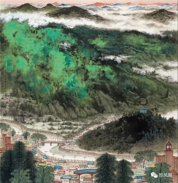 來自南京而定居于深圳的宋玉明,試圖將新金陵畫派表現(xiàn)現(xiàn)實(shí)的變革精神用于現(xiàn)代城市山水畫的探索上。作為新金陵畫派的第二代畫家,宋玉明直接承傳了宋文治表現(xiàn)現(xiàn)代太湖人居環(huán)境秀潤(rùn)而精巧的家法,并將此種大山景加小民居的畫法轉(zhuǎn)用到深圳城市形態(tài)的表現(xiàn)上。這里,我們一方面可以看到深圳作為一個(gè)新興的現(xiàn)代城市借山而筑、注重自然環(huán)境在城市生態(tài)建設(shè)上的積極作用;另一方面,深圳這種與自然相統(tǒng)一的現(xiàn)代化城市建設(shè)理念,也為宋玉明進(jìn)行城市山水畫創(chuàng)作提供了完美的表現(xiàn)對(duì)象。在《深圳文錦渡》等作品里,我們看到了畫家巧妙地將城市現(xiàn)代建筑與自然山水融為一體的表現(xiàn)。這些畫作,大多以勾線渲染的方法表現(xiàn)遠(yuǎn)景中的商用或市政建筑設(shè)施,也因這些建筑被設(shè)置在中遠(yuǎn)景,不僅減少了建筑塑造的困窘,而且突出了這些人居建筑與自然相得益彰的和諧關(guān)系。這些畫作,從嚴(yán)格的意義上說,仍然是山水畫,而宋式小散鋒皴以及云煙雨霧的渲染,也為畫面增添了幽深、恬靜、高雅、平和的意趣與境界。這些畫作,讓我們所熟悉的城市從一個(gè)相對(duì)遙遠(yuǎn)的視角來觀看,既因距離產(chǎn)生了一種從未體驗(yàn)過的美感,也較好地體現(xiàn)了現(xiàn)代城市與自然占位的協(xié)調(diào)統(tǒng)一、舒適宜居的比例關(guān)系。