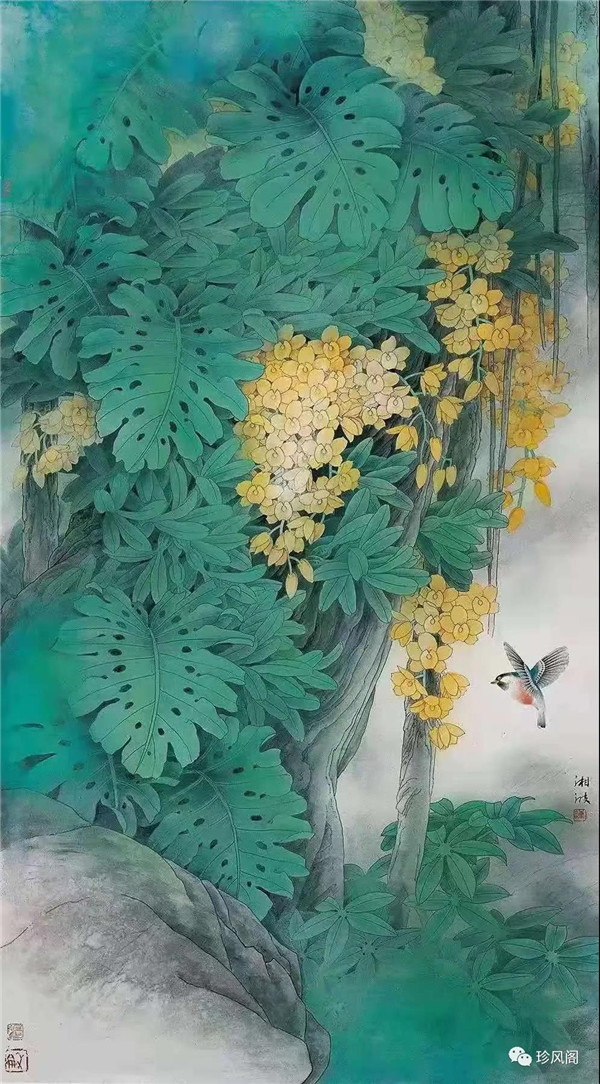 總的來看,陳湘波先生的工筆花鳥畫,繼承了嶺南畫派重生活、重色彩、重創(chuàng)造的優(yōu)秀傳統(tǒng),創(chuàng)作出來的是一系列意境深邃幽遠(yuǎn)的作品。他在繼承傳統(tǒng)的基礎(chǔ)上,借鑒現(xiàn)代設(shè)計(jì)、西方繪畫的元素以及其他畫種的繪畫技法,形成了符合現(xiàn)代人審美的具有個(gè)人風(fēng)格的當(dāng)代工筆花鳥作品。