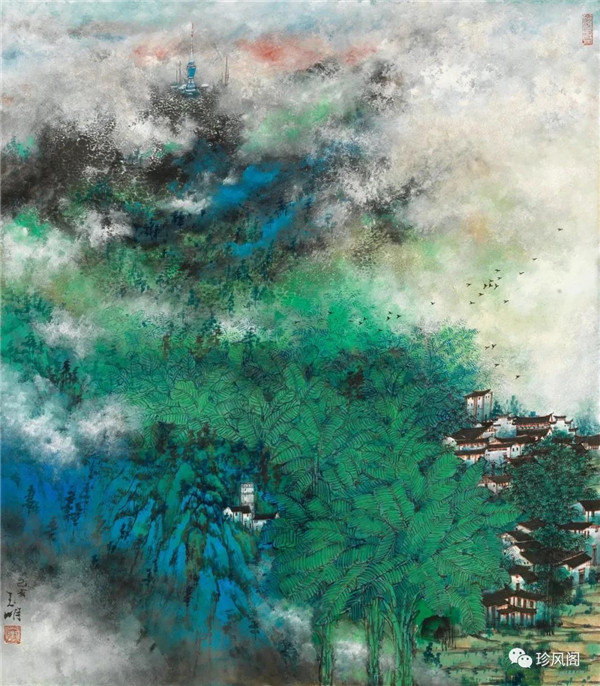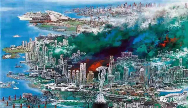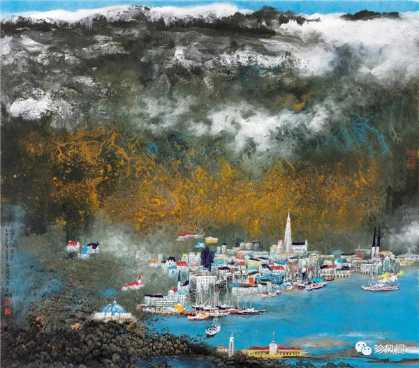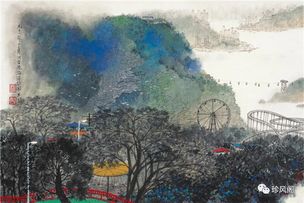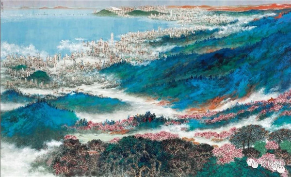 宋玉明從金陵畫派的新傳統(tǒng)跨越到城市表現(xiàn)的積彩拓墨畫法,既體現(xiàn)了現(xiàn)代化城市對(duì)于變革傳統(tǒng)的時(shí)代訴求,也體現(xiàn)了他移居深圳后這座新興城市文化對(duì)于他的深刻影響。畢竟,連續(xù)數(shù)屆的深圳水墨雙年展對(duì)于水墨在跨文化中重要作用與表現(xiàn)方法的突破,都給予他至深的思想開拓。這表明,城市山水畫已不單純是用中國(guó)畫表現(xiàn)城市的命題,而是其中能夠蘊(yùn)含多少城市文化觀念與城市審美的方法,宋玉明對(duì)于城市山水畫的探索,體現(xiàn)的正是這樣一種對(duì)城市現(xiàn)代文化的思想融合性。而不拘謹(jǐn)于城市一磚一石、一街一道、一房一樓的描繪,著眼于發(fā)揮水墨與彩墨表現(xiàn)的自由性,抑或體現(xiàn)了人性、自然與現(xiàn)代城市共同作用的現(xiàn)代生活方式與人文理想。的確,純粹用中國(guó)畫或水墨畫來探索城市的現(xiàn)代化景觀表現(xiàn),也許只是淺層次的審美需求;而只有當(dāng)把山水畫作為人與自然和諧統(tǒng)一的觀念表達(dá)植入城市現(xiàn)代化的審美訴求時(shí),城市山水畫才能真正凸顯出其深刻的美學(xué)價(jià)值。這正是我們從宋玉明的作品里能夠讀解到的他對(duì)于城市山水畫審美理想的一種勾畫。