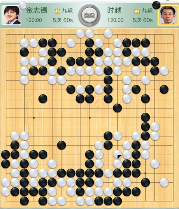 緊接著,時越執(zhí)黑對陣金志錫一局傳來告負(fù)的消息??v觀全局,開局時黑稍好,但中盤攻擊上邊白棋時候方向錯誤,被白棋聯(lián)絡(luò)后自身還留下了白棋開劫的隱患。之后黑棋在劫爭中放棄上方黑子在下邊圍出大模樣爭勝。白棋在黑勢中施展手段時黑棋必需尋求凈殺白子。無奈周邊不夠厚實殺不掉,遂于174手時認(rèn)負(fù)。