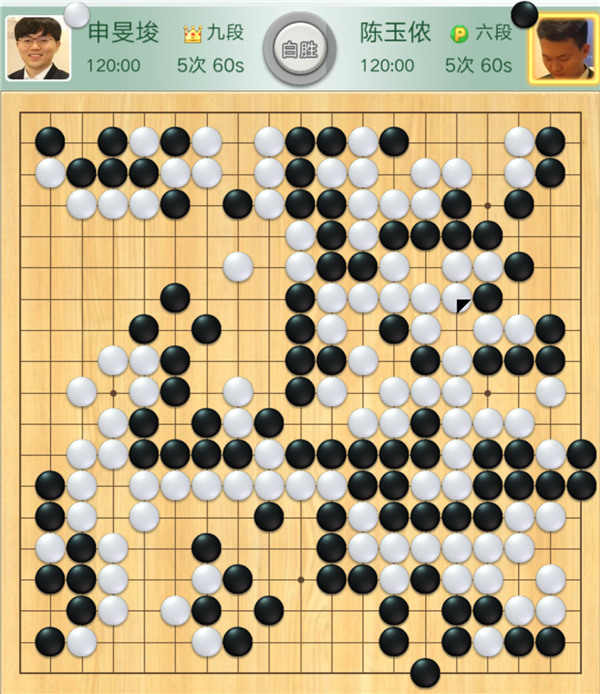 本輪比賽,率先破局取勝的是二臺外援主將申旻埈。是局,申旻俊執(zhí)白對陣三連勝的小將陳玉儂。黑棋開局沖擊右下白棋急躁,白棋處理好后局面大幅領(lǐng)先。黑棋之后在左邊與上邊奮力拼搏,白棋冷靜應(yīng)對,輕松獲勝。行棋204手。