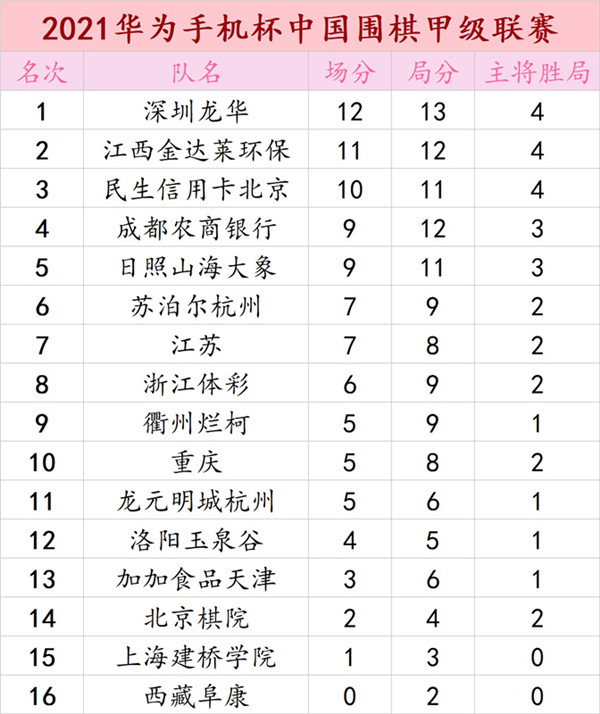 2021華為手機(jī)杯中國圍棋甲級聯(lián)賽第四輪深圳龍華3:1勝衢州爛柯
