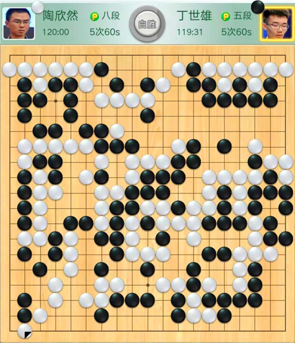 最后一局隨即揭曉:陶欣然“錦上添花”,執(zhí)白完勝丁世雄。布局時,白棋左邊與右上獲利。黑棋進(jìn)攻右邊白棋時候,白棋漂亮棄子搶占左下大棋優(yōu)勢擴(kuò)大。之后白棋穩(wěn)扎穩(wěn)打直至終局獲勝。