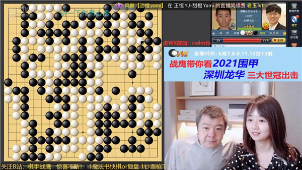 今日大局好,教練羅洗河心情自然好。于是興高采烈地去虎牙直播和戰(zhàn)鷹侃棋了。戰(zhàn)鷹是職業(yè)二段,女子圍甲主力選手,人美、棋強(qiáng)、口才好,虎牙直播間圍棋知名主播,是深圳龍華隊網(wǎng)上直播合作人。深圳龍華隊后續(xù)比賽將持續(xù)在虎牙平臺直播,歡迎大家關(guān)注哦!