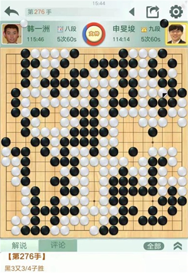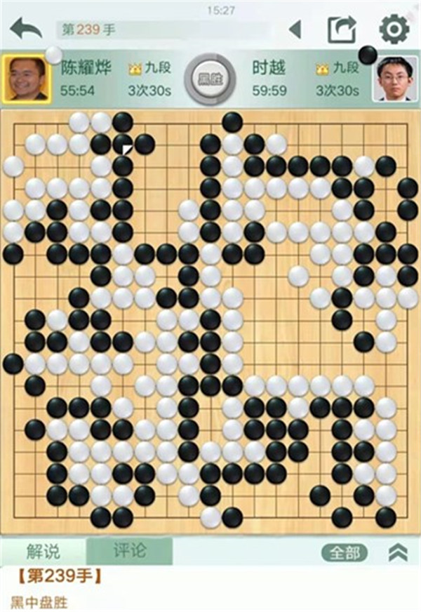 時越快棋執(zhí)黑對陣世界冠軍陳耀燁。中盤黑棋在右邊白勢中試應(yīng)手,白棋應(yīng)對松緩,被黑棋先手便宜十幾目棋,黑局面領(lǐng)先。之后黑棋行棋嚴(yán)謹(jǐn),中盤獲勝。