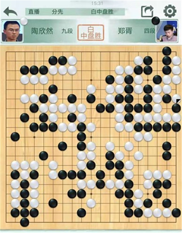 陶欣然執(zhí)白對陣小將鄭胥。黑棋開局在左邊虧損,局面落后。最后黑棋在右邊破釜沉舟尋求戰(zhàn)機(jī),白棋計算精準(zhǔn),將黑全殺,白中盤勝。