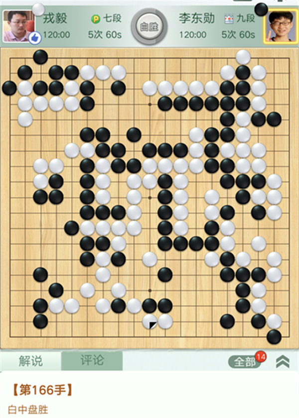 龍華隊(duì)戎毅七段本輪重新披掛上陣,執(zhí)白對陣韓國排名第四的李東勛。開局二十幾手時(shí),黑在左上出現(xiàn)重大失誤,白棋大幅領(lǐng)先。之后,白思路清晰,掌控局面,優(yōu)勢逐漸擴(kuò)大,而速勝。