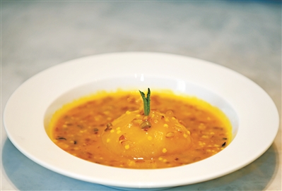 這道菜選擇泰國的西米、江西的紅米、美國的野米、東北的小米和河北的燕麥5種雜糧,預先浸泡蒸熟備用。半個蘋果削皮浸泡鹽水后蒸熟備用。將南瓜蒸熟后用破壁機打成南瓜茸,放入平底鍋,小火加熱,放入五谷雜糧慢慢推至均勻。這道菜神奇的地方,在于如果你喜歡甜,可以放糖作為飯后甜品;如果你喜歡咸味,則可以放鹽,作為代餐主食。調好味道后,放入蘋果加熱到溫度適合,就可以上碟。