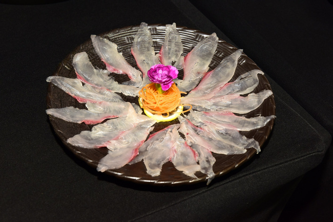 本次品鑒會(huì)晚宴以富谷紅鰭東方鲀?yōu)橹黝},共呈現(xiàn)了七道河豚及相關(guān)產(chǎn)品菜品:包括:紅燒河豚、白汁河豚、白溜河豚魚片、紅燒海參靈芝菇、河豚魚皮絲、河豚魚丸湯、河豚魚水餃等,與會(huì)嘉賓共同品鑒,對河豚食材鮮美贊不絕口。(常軍平)