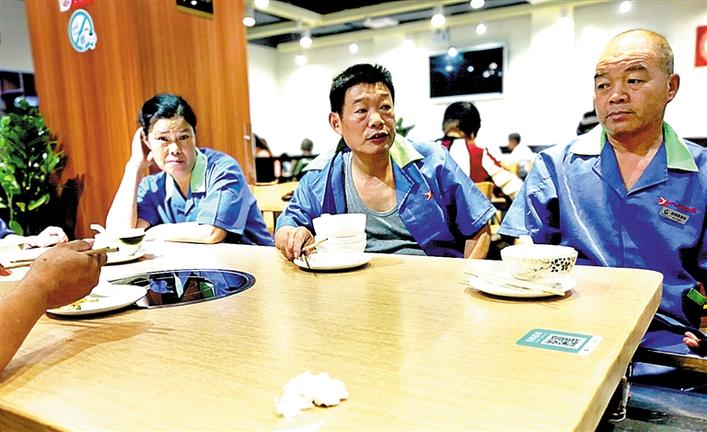在店里吃飯的人群里,有一張臺全是清一色的藍(lán)色工作服,特別顯眼?!拔覀兠刻於紩磉@里吃早餐,差不多有一年時(shí)間了,這里的老板太好了,希望他能一直開下去。”這幾個(gè)大叔、大嬸是周邊物業(yè)的清潔工人,他們每天早上5點(diǎn)鐘就上崗工作,忙完就到了6-7點(diǎn),又餓又累,有一碗熱騰騰的早餐是一件非常幸福的事,而這種開心快樂的事情在這里發(fā)生了。吳姓清潔工說,這里的老板和員工很好,大家來這里吃粥,沒有感到半點(diǎn)不自在,就像在自己家一樣。