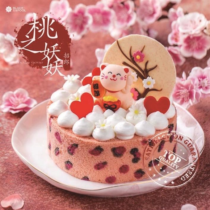 據黑池產品經理介紹,“招郎蛋糕”是黑池最近重磅推出的新產品。蛋糕周圍覆盆子果干點綴而成的粉色豹紋,讓整個蛋糕充滿了野性魅惑又不失少女甜美。最為吸引眼球的,則是蛋糕表面,被桃花簇擁著的一只“招郎喵”。這只軟萌可愛的“招郎喵”,象征著,對得到這款蛋糕的人,最美好的祝愿,希望他們能夠遇到最好的愛情,找到心目中的那個他。