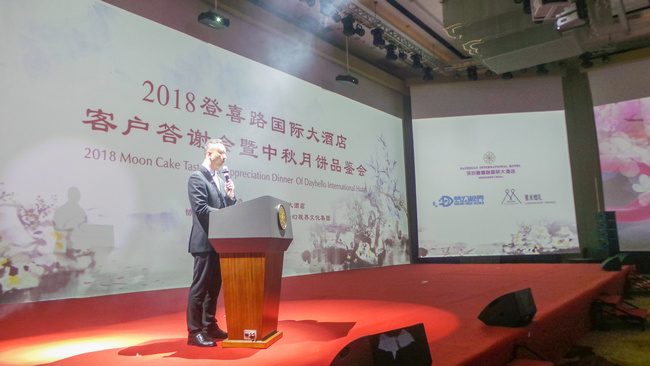 活動(dòng)開始,登喜路國際大酒店總經(jīng)理譚志堅(jiān)先生為晚會(huì)致辭。譚先生希望借此次品鑒會(huì),讓來賓對登喜路月餅有全新的認(rèn)識(shí),更衷心的希望,在這次晚宴上彼此能夠進(jìn)行深入溝通,增進(jìn)互信,加強(qiáng)合作,共敘友誼,共謀發(fā)展!