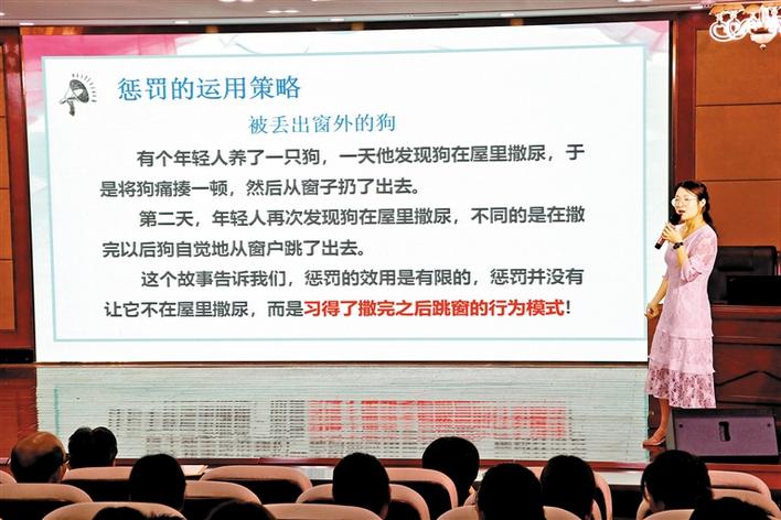 講座中,齊玲老師介紹三體腦精神,然后圍繞“馬斯洛需求層次理論”五個板塊結(jié)合實例進行具體講解:一、生理需求;二、安全需要,根據(jù)羅森塔爾效應(yīng),指出教師應(yīng)以積極發(fā)展的眼光看待孩子;三、社交需要;四、尊重的需要,從內(nèi)部認(rèn)可的鼓勵到外部認(rèn)可的鼓勵會導(dǎo)致“德西效應(yīng)”;五、自我實現(xiàn)需求。期間,她通過各項案例,以常見的心理問題為例,層層推進,逐步告訴老師們面對此類問題的解決辦法,令老師們受益匪淺。