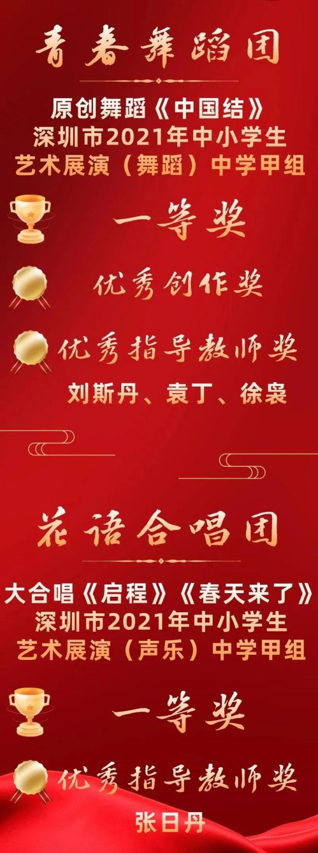 二實(shí)青春舞蹈團(tuán)以原創(chuàng)作品《中國(guó)結(jié)》在全市各區(qū)以及市直屬學(xué)校選拔出來的37個(gè)節(jié)目中脫穎而出,獲得全場(chǎng)最高分!接下來,青春舞蹈團(tuán)將代表深圳市參加省賽,有望沖擊全國(guó)決賽!此外,二實(shí)花語合唱團(tuán)也憑借大合唱《啟程》《春天來了》榮獲深圳市2021年中小學(xué)藝術(shù)展演(聲樂)中學(xué)甲組一等獎(jiǎng)。劉斯丹、袁丁、徐裊、張日丹等老師榮獲優(yōu)秀指導(dǎo)老師獎(jiǎng)。