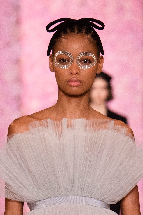 秀場(chǎng)上璀璨奪目的創(chuàng)意水晶元素面部裝飾,均出自化妝師伊莎瑪雅·弗倫奇(Isamaya Ffrench)之手。她選擇了不同尺寸的透明長(zhǎng)方平底石和天宇長(zhǎng)方平底石,并將它們以畫(huà)框的形式點(diǎn)綴在模特眼周,交相輝映出無(wú)限純凈光彩。