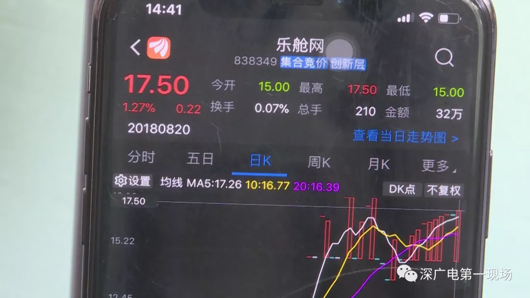 按照劉某的說法,張女士以每股15塊錢購得了3萬股原始股,并可以隨時回籠資金,今天記者登錄股票交易賬戶,查詢到張女士購入的這支“樂艙網”股票,此前一直走勢較低,在張女士買入當天,股價才有了上漲。
