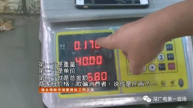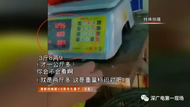 陳先生表示,實(shí)際上,剛剛拿去公平稱上的龍蝦只有1.29公斤左右,大約2斤6兩,和這位海鮮檔攤販所說的3斤8兩,差了一斤多。