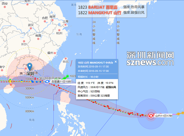 深圳新聞網(wǎng)9月12日訊(記者 施冰冰)記者從深圳市氣象局了解到位于臺灣東南部海面的熱帶擾動(dòng)已于10日8時(shí)加強(qiáng)為熱帶低壓,預(yù)計(jì)該熱帶低壓將于11日進(jìn)入南海,并加強(qiáng)為今年第23號臺風(fēng),12日下午到夜間從深圳市偏南方200-250公里的海面上掠過,13日白天在廣東電白到海南瓊海之間的沿海地區(qū)登陸。此外,今年第22號臺風(fēng)“山竹”已于7日夜間生成,10日14 時(shí)位于深圳市東南方約3500公里的西北太平洋洋面上,中心附近最大風(fēng)力13級。未來將以30公里左右的時(shí)速向偏西方移動(dòng),最強(qiáng)可達(dá)超強(qiáng)臺風(fēng),15日進(jìn)入南海,16-17日嚴(yán)重影響廣東。