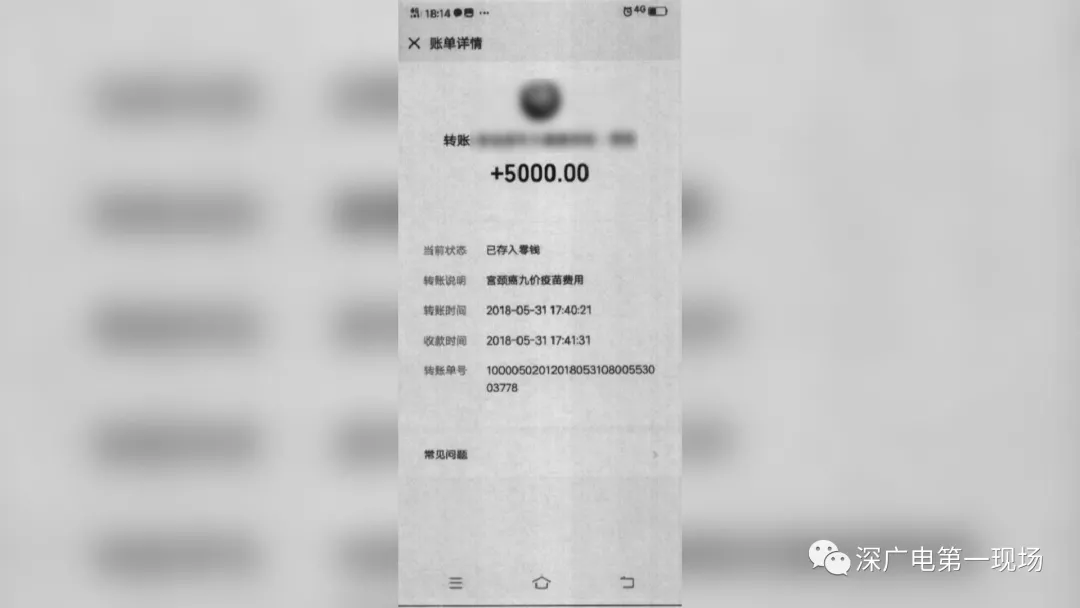 今年5月份,寶安的郭小姐接到前同事蔣某的推銷(xiāo)電話,自稱可以預(yù)約到香港注射HPV9價(jià)疫苗,而郭小姐剛好有這方面的需求,眼看辦公室的好多女生都轉(zhuǎn)錢(qián)找蔣某預(yù)約,自己不假思索也轉(zhuǎn)了五千。