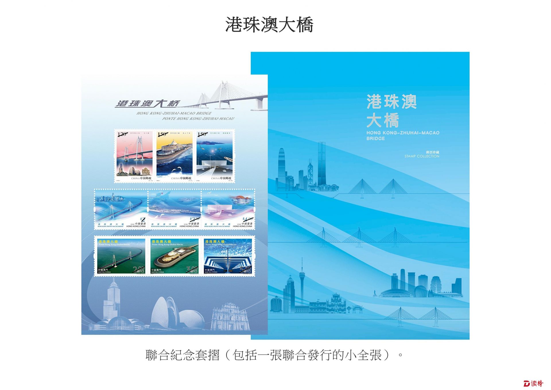 為紀(jì)念大橋啟用,中國(guó)郵政、香港郵政和澳門(mén)郵電于同日共同發(fā)行一款聯(lián)合紀(jì)念套折,內(nèi)附一張小全張,嵌有由三地郵政發(fā)行的特別郵票各一套。