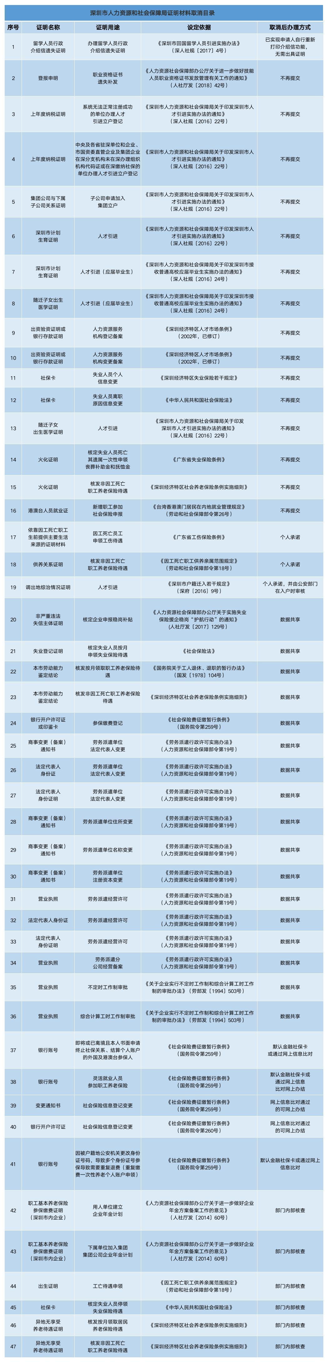 深圳新聞網(wǎng)2019年7月25日訊(見圳客戶端、深圳新聞網(wǎng)記者 施冰冰)據(jù)“深圳人社”微信公眾號消息,為了減證便民、優(yōu)化服務,深圳市人力資源和社會保障局取消了47項證明材料。其中包括新增職工參加社會保險申報,港澳臺人員就業(yè)證不用再提交;人才引進(應屆畢業(yè)生),深圳市計劃生育證明、隨遷子女出生醫(yī)學證明無需再提交;勞務派遣單位法定代表人變更,法定代表人身份證、商事變更(備案)通知書等實現(xiàn)數(shù)據(jù)共享等等等等……