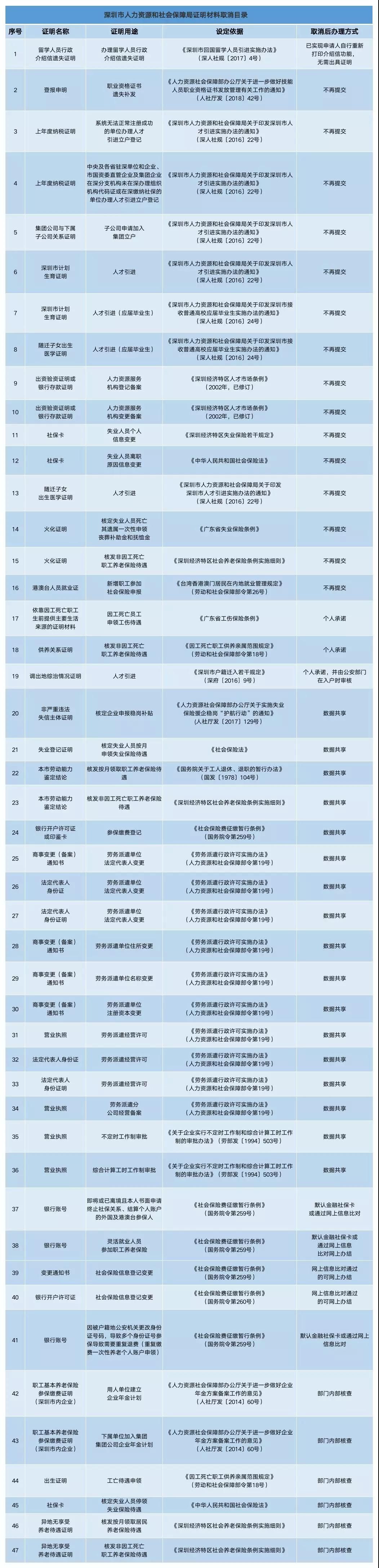 記者梳理發(fā)現(xiàn),這47項(xiàng)證明材料包括:新增職工參加社會(huì)保險(xiǎn)申報(bào),港澳臺(tái)人員就業(yè)證不用再提交;人才引進(jìn)(應(yīng)屆畢業(yè)生),深圳市計(jì)劃生育證明、隨遷子女出生醫(yī)學(xué)證明無(wú)需再提交;勞務(wù)派遣單位法定代表人變更,法定代表人身份證、商事變更(備案)通知書(shū)等。
