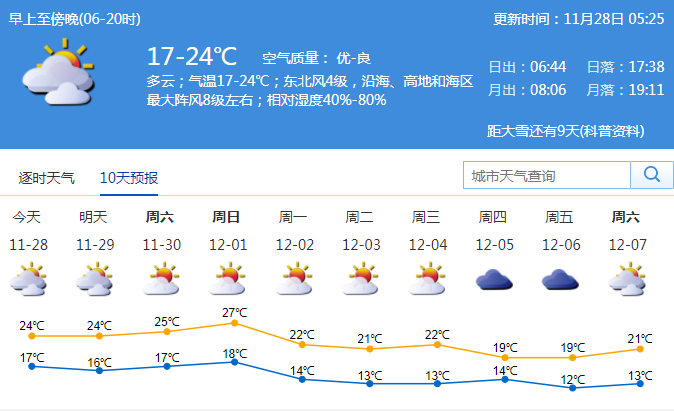 受弱冷空氣補(bǔ)充影響,28日全市多云間晴天,早晚清涼,最低氣溫徘徊在17℃左右,中午前后最高氣溫升至24℃左右。沿海、高地和海區(qū)風(fēng)力加大,最大陣風(fēng)6-7級(jí)??諝夥浅8稍?,注意用火安全。