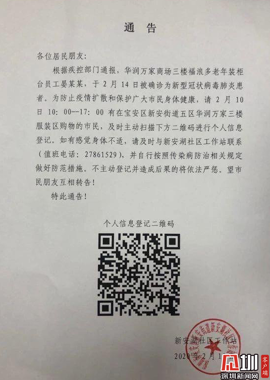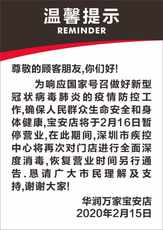 見圳客戶端·深圳新聞網(wǎng)2020年2月16日訊(見圳客戶端、深圳新聞網(wǎng)記者 陳婕)根據(jù)疾控部門通報(bào),寶安區(qū)新安街道五區(qū)華潤(rùn)萬(wàn)家商場(chǎng)三樓福浪多老年裝柜臺(tái)一員工,于2020年2月14日被確診為新型冠狀病毒肺炎患者。記者從華潤(rùn)萬(wàn)家寶安店公告獲悉,該店于2月16日暫停營(yíng)業(yè),在此期間,深圳市疾控中心將再次對(duì)門店進(jìn)行全面深度消毒,恢復(fù)營(yíng)業(yè)時(shí)間將另行通知。