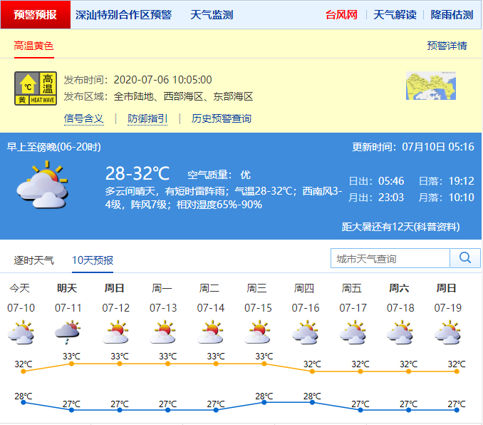 見圳客戶端?深圳新聞網(wǎng)2020年7月10日訊 根據(jù)深圳氣象局消息,深圳7月10日多云間晴天,有短時雷陣雨;氣溫28-32℃;西南風(fēng)3-4級,陣風(fēng)7級;相對濕度65%-90%。