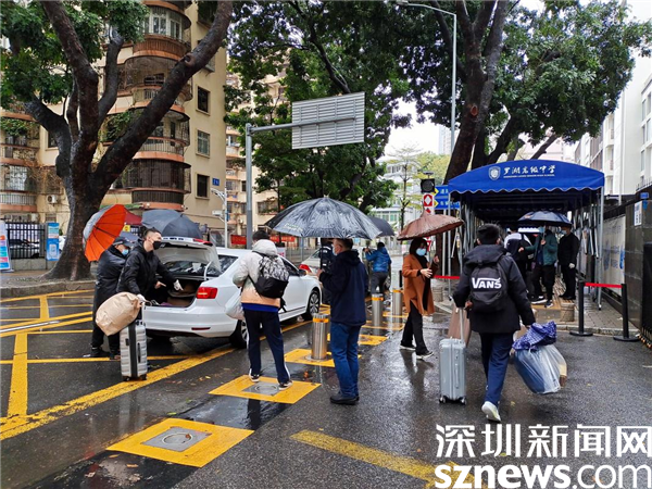 上午8:00左右,深圳市羅湖高級中學高三學子陸續(xù)返校。大雨雖然下個不停,但是學生們返校的心情卻絲毫沒有受到影響。在校門口,老師、學校物業(yè)工作人員為學生們撐傘、對行李進行消毒、協(xié)助掃碼填報信息,有序幫助學生接過行李并用小推車運送至宿舍樓。“這次開學和以往開學有所不同,我的感觸也很深。下著大雨,老師們忙前忙后為我們運送行李,覺得非常感動?!绷_湖高級中學高三學子張睿說道。