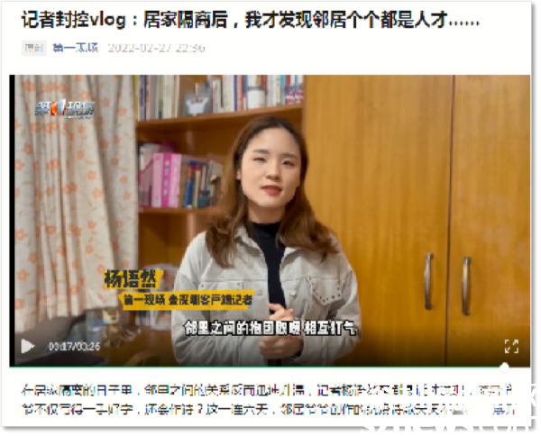 住在華瑞大廈A座封控區(qū)的第一現(xiàn)場記者楊語然,每天拍攝視頻記錄封控生活。在她的鏡頭下,封控區(qū)防疫工作有條不紊,民生服務暖心到位,鄰里之間抱團取暖、相互打氣。她表示,因為這段“特殊的”居家隔離時光,鄰里之間的關(guān)系反而迅速升溫,每天在微信群里互動,才知道住在一起的鄰居們那么多才多藝。