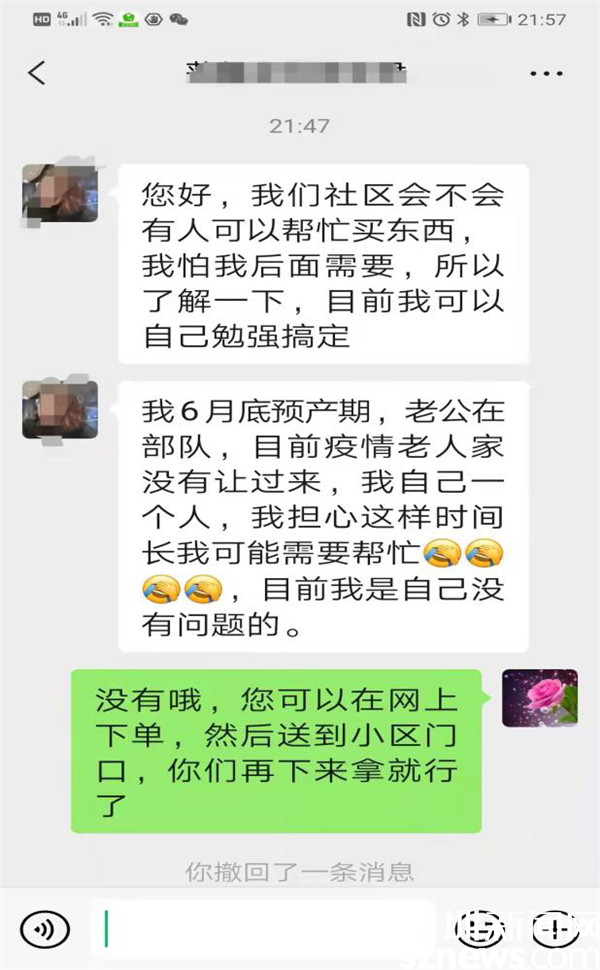 3月13日晚近十點(diǎn),家住蓮塘街道蓮馨家園的黃女士通過微信向畔山社區(qū)黨委副書記鄒紅梅求助,詢問社區(qū)能否在自己待產(chǎn)不方便的情況下幫助購物送貨……。原來,黃女士預(yù)產(chǎn)期在6月份,丈夫在部隊(duì)服役,因?yàn)橐咔樵?,家中老人無法過來深圳照顧,只能自己在家休養(yǎng),心理壓力較大顧慮較多。了解到情況后,鄒紅梅耐心疏導(dǎo)黃女士焦慮和恐慌情緒,說明社區(qū)的關(guān)愛措施,并微信回復(fù)說,“需要幫忙,可以找我們。放心吧,有我們?cè)??!?/p>