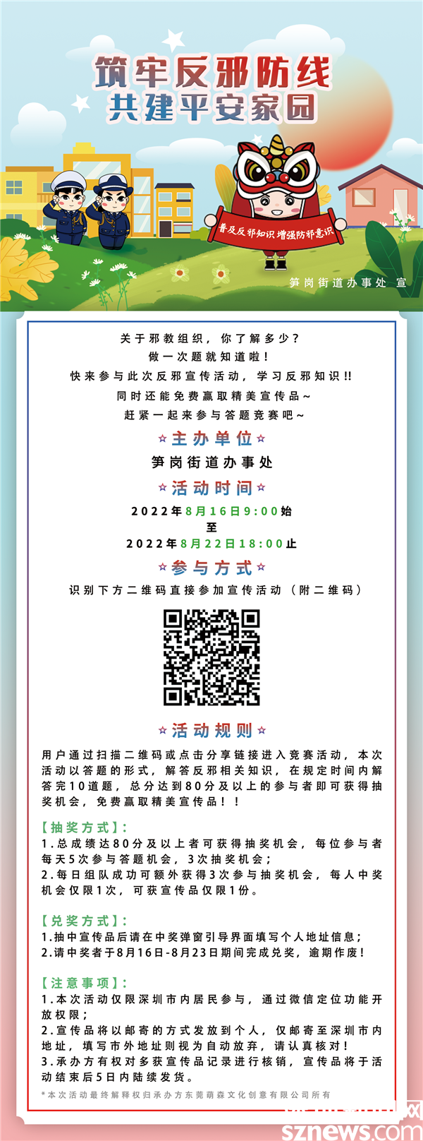 為做好反邪教警示教育宣傳工作,引導轄區(qū)內(nèi)居民進一步認清邪教危害,提高反邪教意識和能力,營造“無邪羅湖、和諧社區(qū)”濃厚氛圍,筍崗街道持續(xù)開展以“防范邪教侵害、守護平安家園”為主題的反邪教宣傳系列活動,實現(xiàn)反邪教宣傳全覆蓋。