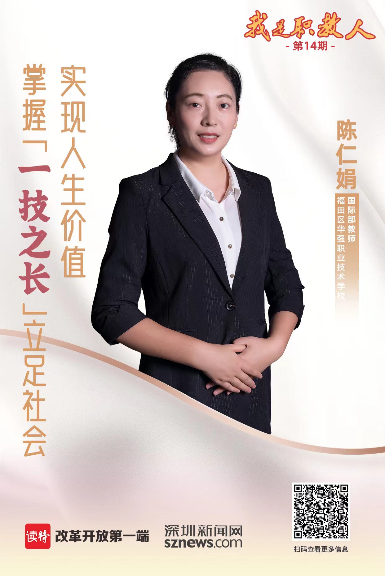 抱著對(duì)教師行業(yè)的熱愛和教書育人的向往,深圳市福田區(qū)華強(qiáng)職業(yè)技術(shù)學(xué)校國(guó)際部教師陳仁娟,畢業(yè)后遵循從教初心,成為職教老師至今已有九年。