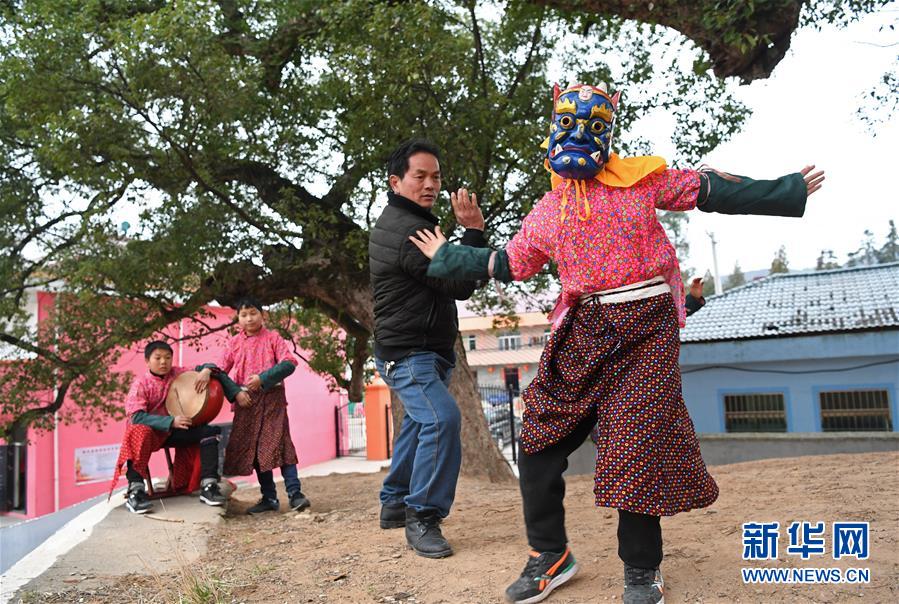 在江西省南豐縣的三溪鄉(xiāng)石郵村,葉根明(右二)向“小儺師”傳授技藝(2月21日攝)。