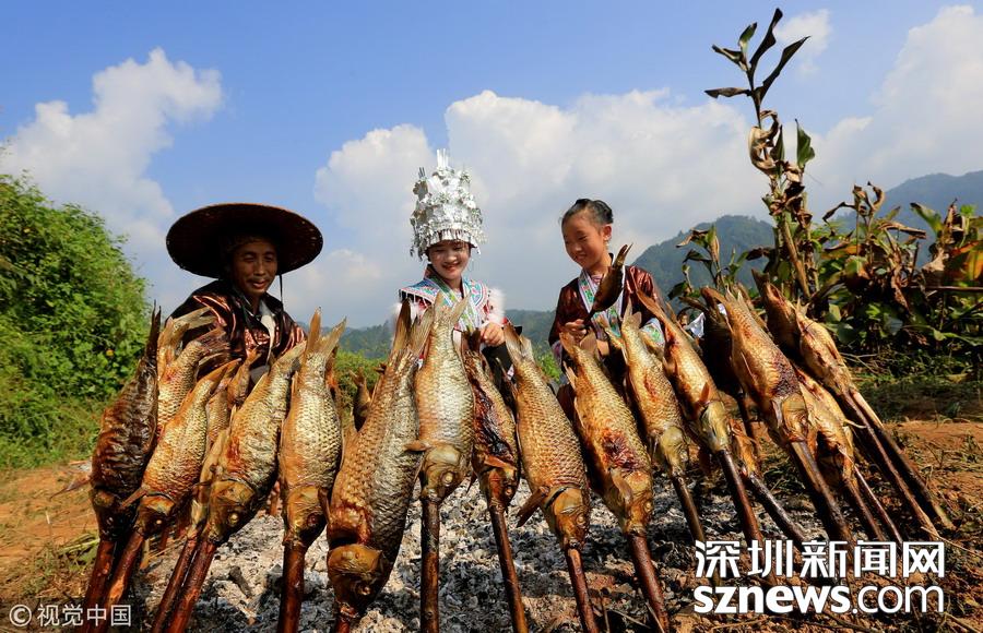 2016年9月17日,貴州省榕江縣平陽鄉(xiāng)硐里村七位侗家婦女們正燒魚。每年中秋時節(jié),當?shù)囟弊逋_田放水,捉魚,全寨男女老少,野外生起篝火烤魚,用烤魚、米酒等,祭祀魚神,祈禱魚糧豐收的傳統(tǒng)民俗活動。