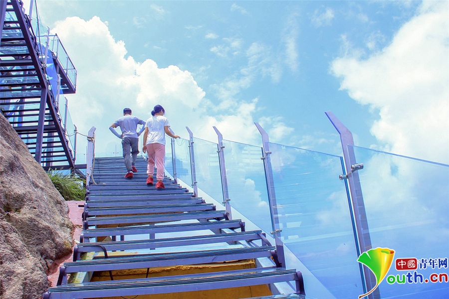 2018年8月,廣東清遠(yuǎn)。如今,玻璃橋、玻璃觀景臺(tái)、玻璃漂流道、玻璃滑道等玻璃產(chǎn)品可以說(shuō)多如牛毛,琳瑯滿(mǎn)目。這些玻璃產(chǎn)品都是水平的,即使有坡度,也是借助工具滑下去的。小伙伴們是否挑戰(zhàn)體驗(yàn)過(guò)像樓梯一樣的玻璃天梯,階梯式攀向高處,直聳云宵,云霧飄渺。