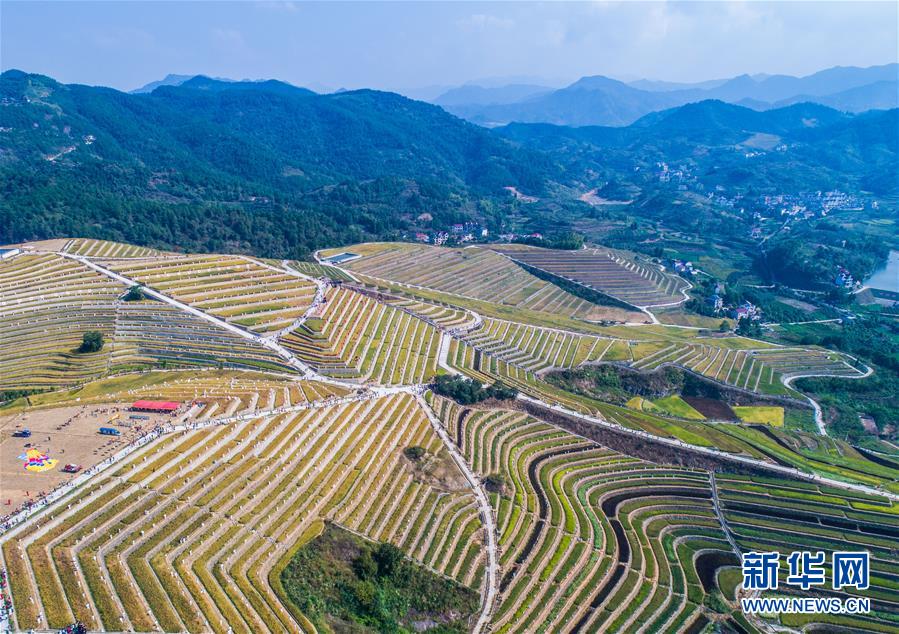 9月29日拍攝的秋日中的建德市大洋鎮(zhèn)高垣村梯田風(fēng)景。當(dāng)日,2000多名太極拳愛好者在浙江省建德市大洋鎮(zhèn)高垣村的千畝梯田上參加太極拳表演,吸引很多當(dāng)?shù)厝撕陀慰颓皝碛^賞,助力當(dāng)?shù)亟鹎飼r(shí)節(jié)鄉(xiāng)村旅游。近兩年來,大洋鎮(zhèn)充分利用土地整治后形成的千畝梯田打造農(nóng)業(yè)觀光綜合體,發(fā)展綜合型農(nóng)業(yè)觀光旅游,為鄉(xiāng)村振興注入新活力。新華社記者徐昱攝