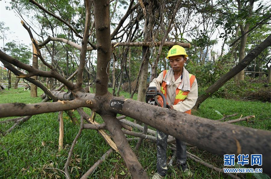 10月1日,工作人員在深圳街頭的綠化帶清理強(qiáng)臺(tái)風(fēng)“山竹”損毀的樹木。當(dāng)日是國(guó)慶節(jié),許多勞動(dòng)者堅(jiān)守在工作一線,在崗位上度過節(jié)日。新華社記者毛思倩攝