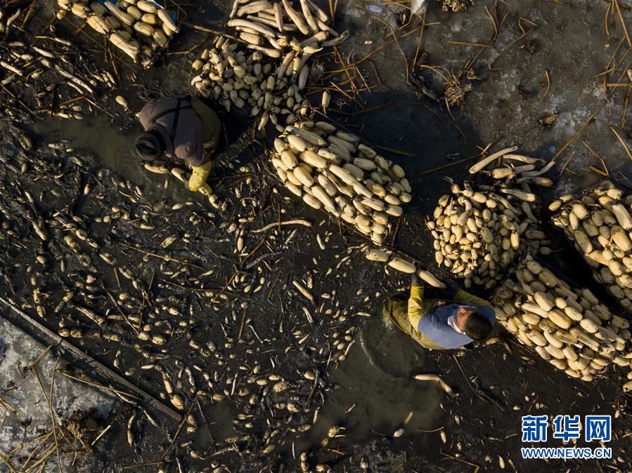 白洋淀深冬挖藕人