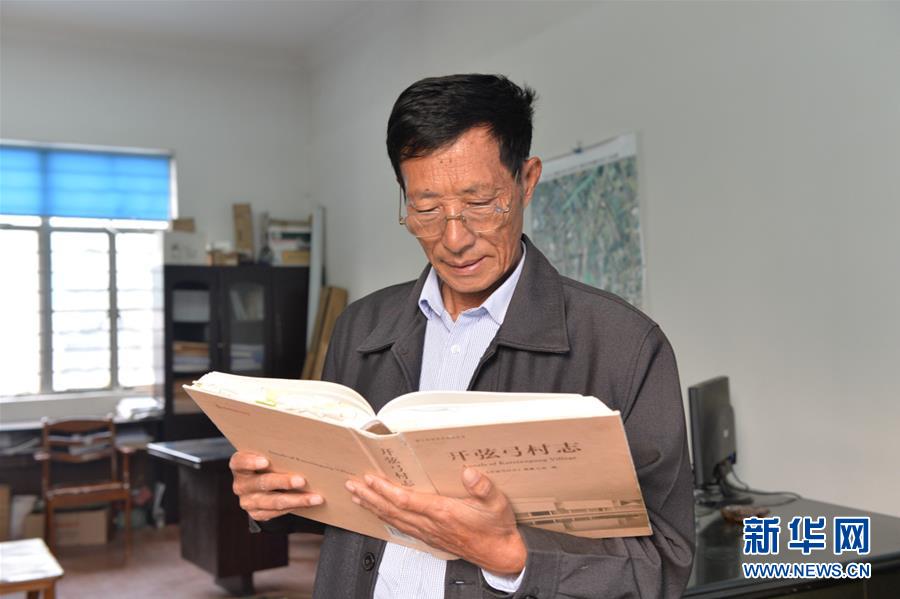 “50后”村民姚富坤(左)在村部閱讀《開弦弓村志》(10月23日攝)。姚富坤退休前是村里的農技員,熱心于向外界介紹開弦弓村的傳統(tǒng)民俗和鄉(xiāng)土文化,參與了村志編修,被當?shù)厝朔Q為“農民教授”。新華社記者 尹棟遜攝