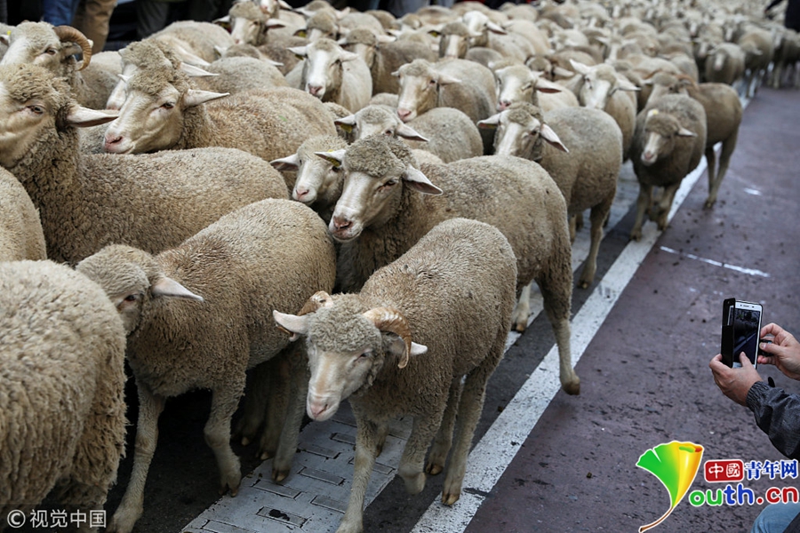 西班牙牧羊人驅(qū)趕羊群穿越馬德里 羊群進城“參觀”