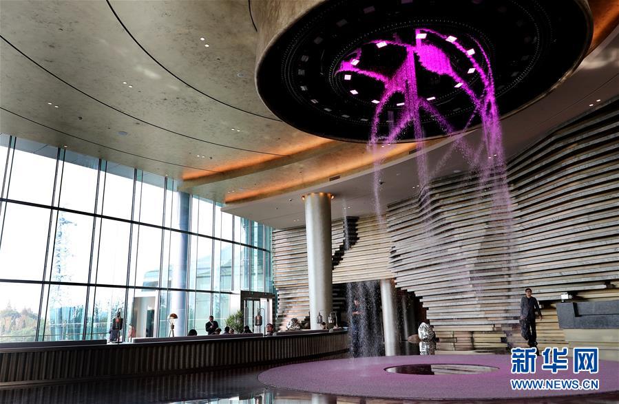 這是世茂洲際酒店大堂內(nèi)的水幕裝置(11月13日攝)。 位于上海松江的世茂洲際酒店11月15日正式開(kāi)門(mén)營(yíng)業(yè)。這家在一個(gè)廢棄采石礦坑內(nèi)建成的酒店成為上海又一新景。 新華社記者 方喆 攝