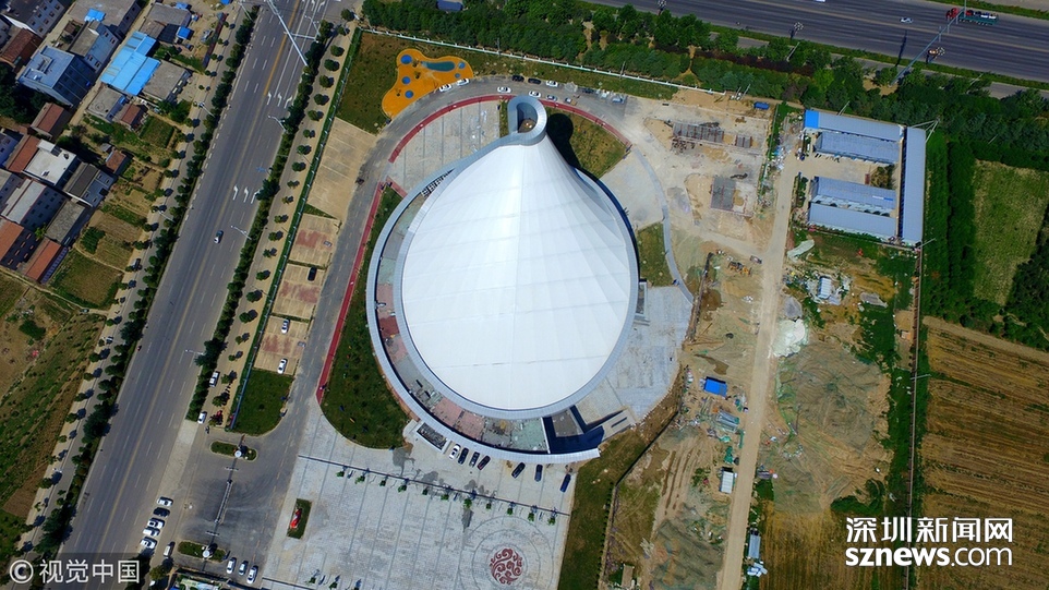 2018年6月13日,航拍河南淮陽(yáng)一座即將竣工落成的體育場(chǎng)館建筑,市民稱(chēng)酷似一個(gè)石磨盤(pán)。