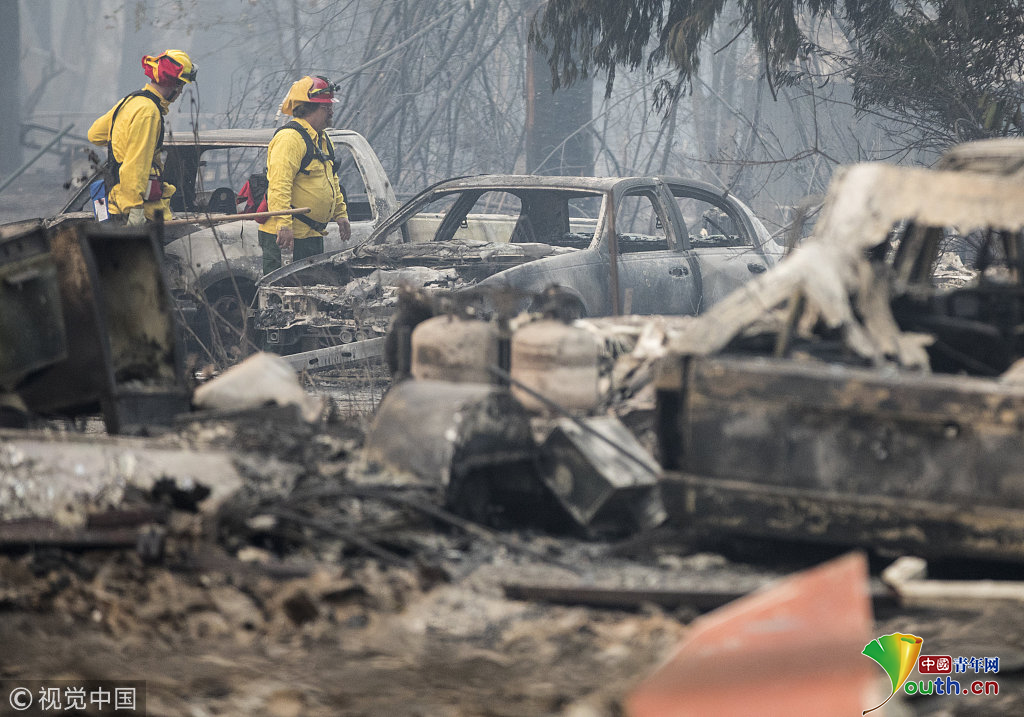 11月18日,在美國(guó)加利福尼亞州比尤特縣天堂鎮(zhèn),救援人員在山火廢墟中工作。
