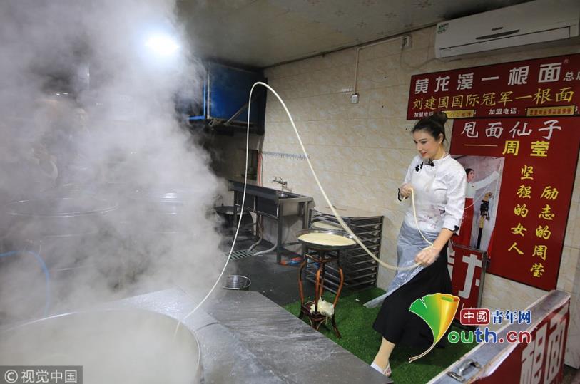 2018年11月19日,成都,繼“妖嬈拉面哥”之后,黃龍溪古鎮(zhèn)一個身材高挑的古裝美女,一邊跳舞一邊揮甩著手中的面條被贊“甩面仙子”走紅網(wǎng)絡。圖片作者:紅葉/視覺中國